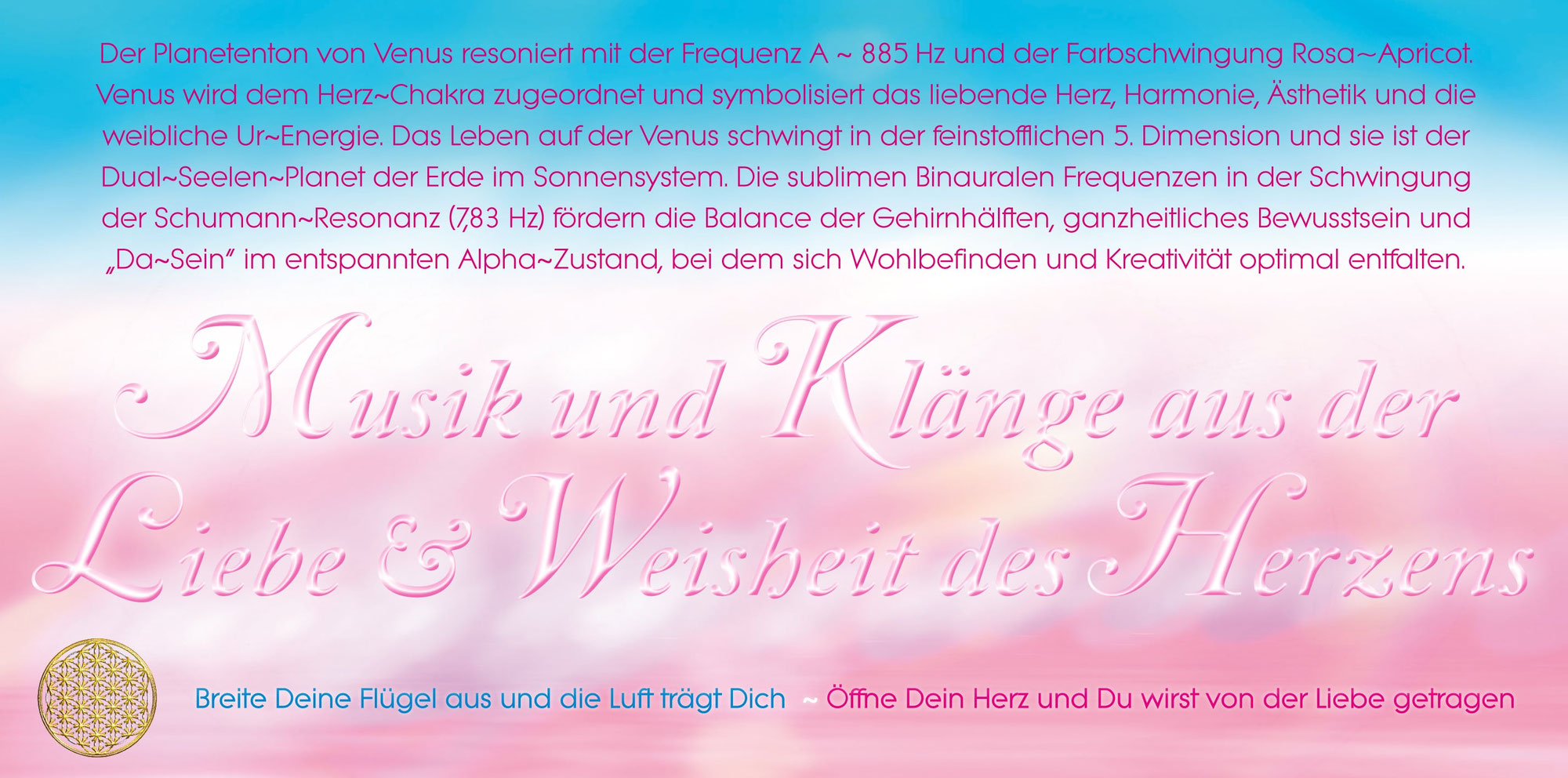 Der Planetenton von Venus resoniert mit der Frequenz A ~ 885 Hz und der Farbschwingung Rosa~Apricot. Venus wird dem Herz~Chakra zugeordnet und symbolisiert das liebende Herz, Harmonie, Ästhetik und die weibliche Ur~Energie. Das Leben auf der Venus schwingt in der feinstofflichen fünften Dimension, und sie ist der Dual~Seelen~Planet der Erde im Sonnensystem. Die sublimen Binauralen Frequenzen in der Schwingung der Schumann~Resonanz (7,83 Hz) fördern die Balance der Gehirnhälften, ganzheitliches Bewusstsein und »Da~Sein« im entspannten Alpha~Zustand, bei dem sich Wohlbefinden und Kreativität optimal entfalten.