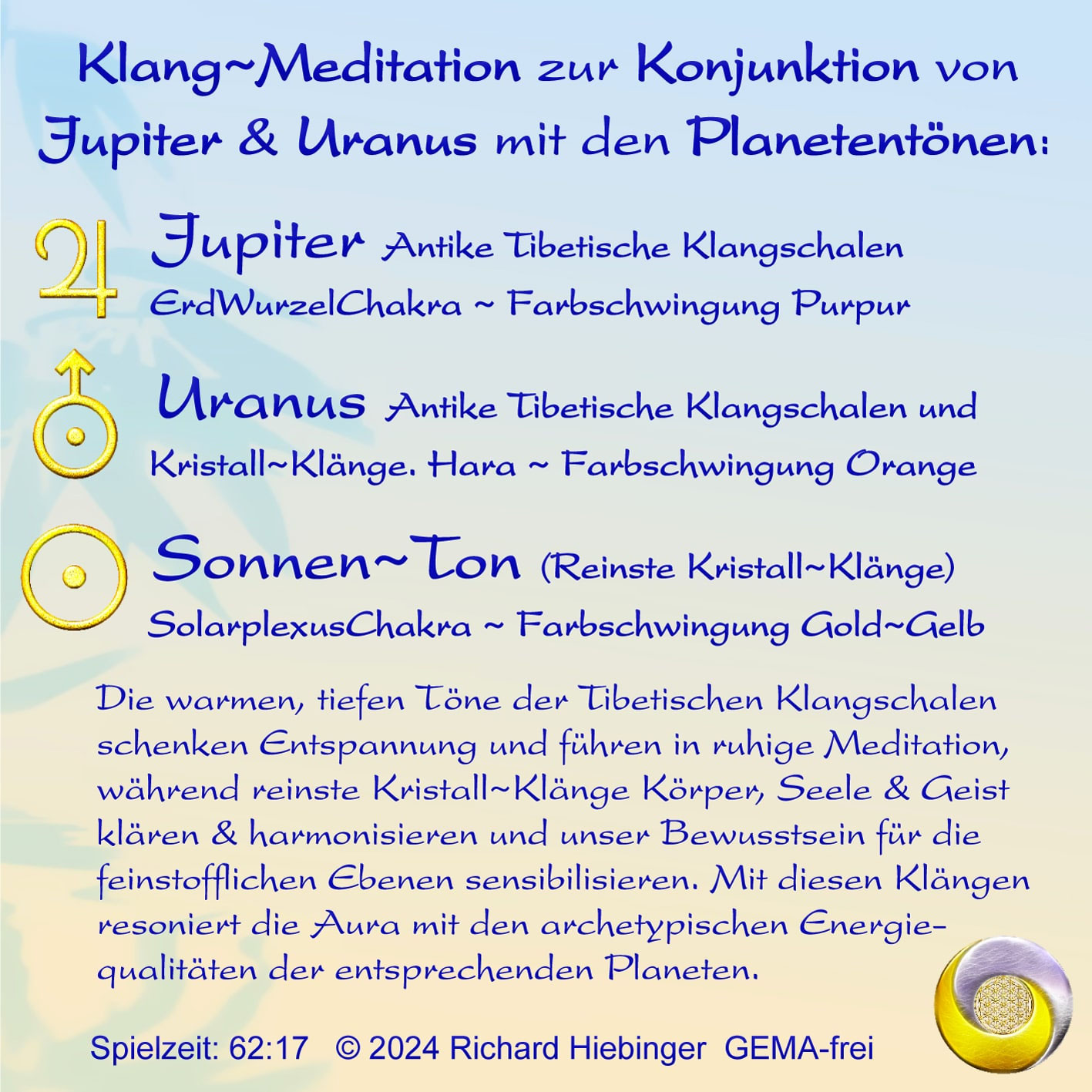 Tibetische Klangschalen & Kristall~Klänge für deine Meditation zur Konjunktion von Jupiter & Uranus mit den Planetentönen. Die warmen, tiefen Klänge der Klangschalen fördern Entspannung und Meditation. Die Kristall~Klänge klären & harmonisieren Körper, Seele & Geist. Die archetypischen Energien der Planeten schwingen in deiner Aura und repräsentieren Freiheit, Erneuerung, Wohlstand und Lebensglück auf allen Ebenen.