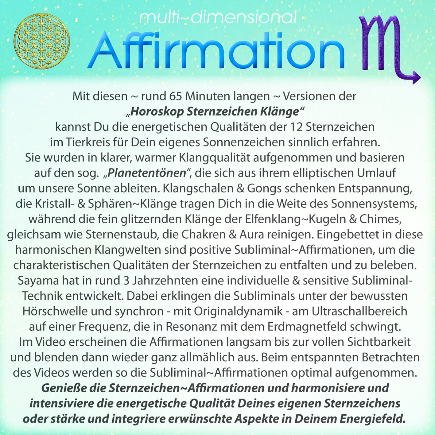 Mit diesen ~ rund 65 Minuten langen ~ Versionen der „Horoskop Sternzeichen Klänge“ kannst Du die energetischen Qualitäten der 12 Sternzeichen im Tierkreis für Dein eigenes Sonnenzeichen sinnlich erfahren. Sie wurden in klarer, warmer Klangqualität aufgenommen und basieren auf den sog. „Planetentönen“, die sich aus ihrem elliptischen Umlauf um unsere Sonne ableiten. Klangschalen & Gongs schenken Entspannung, die Kristall- & Sphären~Klänge tragen Dich in die Weite des Sonnensystems, während die fein glitzernden Klänge der Elfenklang~Kugeln & Chimes, gleichsam wie Sternenstaub, die Chakren & Aura reinigen. Eingebettet in diese harmonischen Klangwelten sind positive Subliminal~Affirmationen, um die charakteristischen Qualitäten der Sternzeichen zu entfalten und zu beleben. Sayama hat in rund 3 Jahrzehnten eine individuelle & sensitive Subliminal-Technik entwickelt. Dabei erklingen die Subliminals unter der bewussten Hörschwelle und synchron - mit Originaldynamik - am Ultraschallbereich auf einer Frequenz, die in Resonanz mit dem Erdmagnetfeld schwingt. Im Video erscheinen die Affirmationen langsam bis zur vollen Sichtbarkeit und blenden dann wieder ganz allmählich aus. Beim entspannten Betrachten des Videos werden so die Subliminal~Affirmationen optimal aufgenommen. Genieße die Sternzeichen~Affirmationen und harmonisiere und intensiviere die energetische Qualität Deines eigenen Sternzeichens oder stärke und integriere erwünschte Aspekte in Deinem Energiefeld.