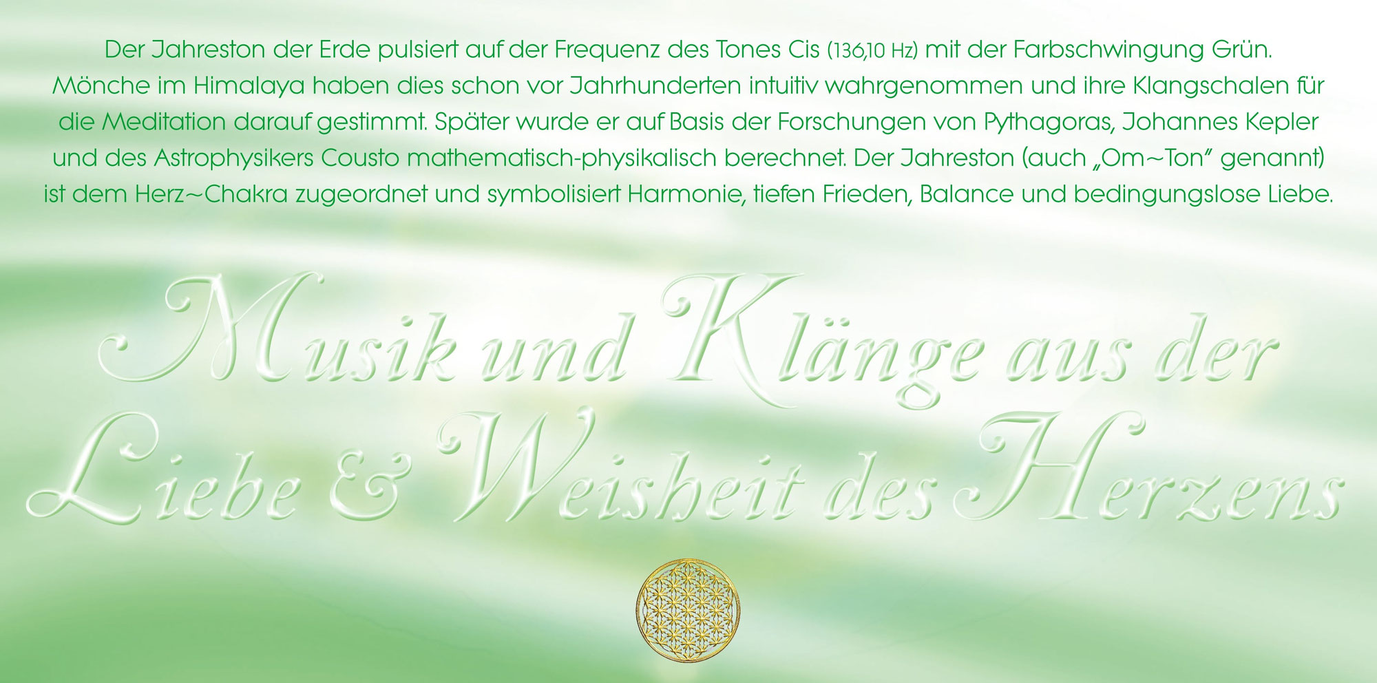 Harmonisch und einfühlsam schwingen Tibetische Klangschalen, Gongs, Cello, keltische Harfe und die japanische Bambusflöte “Shakuhachi” gemeinsam auf dem Jahreston der Erde “OM” ~ dem Sinnbild für Harmonie, tiefen Frieden, Balance und bedingungslose Liebe. Diese Klangwelten öffnen und harmonisieren das Herz~Chakra, umhüllen die Aura mit liebevollen und heilsamen Schwingungen und eröffnen einen Weg zum eigenen Herzen. In der Mitte des Seins fühlen wir uns in einem weiten Raum von Fülle getragen und durch jeden Atemzug mit der Lebenskraft verbunden. Harmonie und tiefer Friede erfüllen das Herz~Chakra.