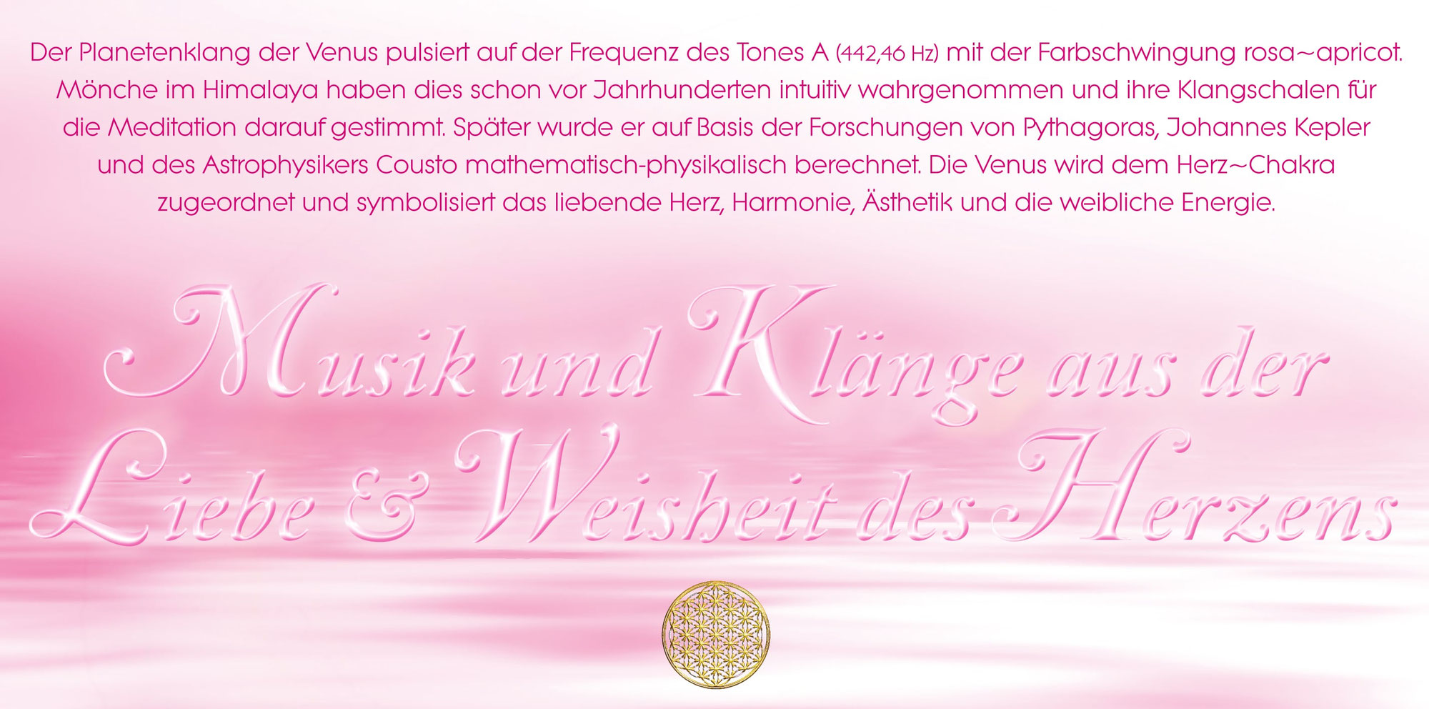 Harmonisch und einfühlsam schwingen Tibetische Klangschalen, sanfte Pianomelodien und die indianische "Golden Eagle Flöte" gemeinsam auf dem Ton der Venus ~ dem Sinnbild für das liebende Herz, Harmonie, Ästhetik und die weibliche Energie. Diese Klangwelten öffnen und harmonisieren das Herz~Chakra, umhüllen die Aura mit liebevollen und heilsamen Schwingungen und eröffnen einen Weg zum eigenen Herzen. In der Mitte des Seins fühlen wir uns in einem weiten Raum von Fülle getragen und durch jeden Atemzug mit der Lebenskraft verbunden. Harmonie und tiefer Friede erfüllen das Herz~Chakra.