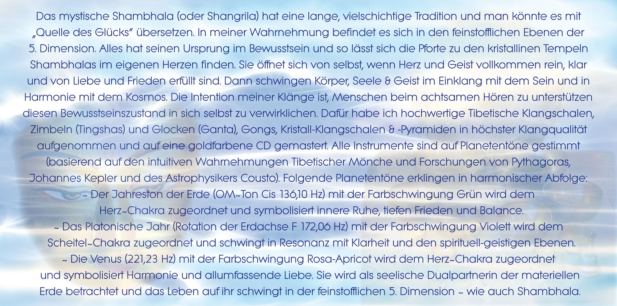 Warme, harmonische Klangwellen von Tibetischen Klangschalen und reine, hochschwingende Töne von Kristall-Klangschalen und -Pyramiden laden ein zu einer musikalisch~energetischen Reise zum mystischen Shambhala ~ dem spirituellen Zentrum der Erde. In dieser reinen Schwingung werden die energetischen Ebenen des Körpers und der ganzen Aura durchlichtet und harmonisiert. Unser Da~Sein ruht in tiefem inneren Frieden und im Einklang von Körper, Seele & Geist in den weisen und heilsamen Licht- & Klangwellen der schöpferischen Lebenskraft.