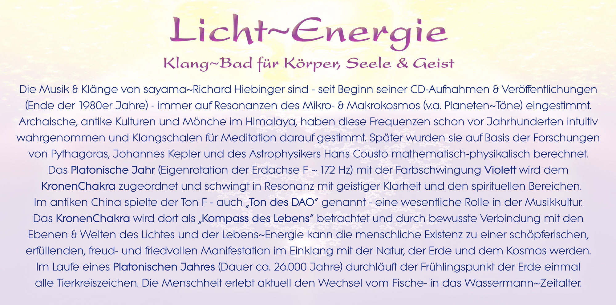 Perlende Harfenklänge, sanfte Bambusflöten, Antike Tibetische Klangschalen, Kristall~Klänge, PAISTE Planet Gongs & Sphärenklänge lassen ein licht- und energievolles Klang~Ambiente entstehen. Körper, Seele & Geist können darin wie in ein reinigendes und belebendes Klang~Bad eintauchen.
