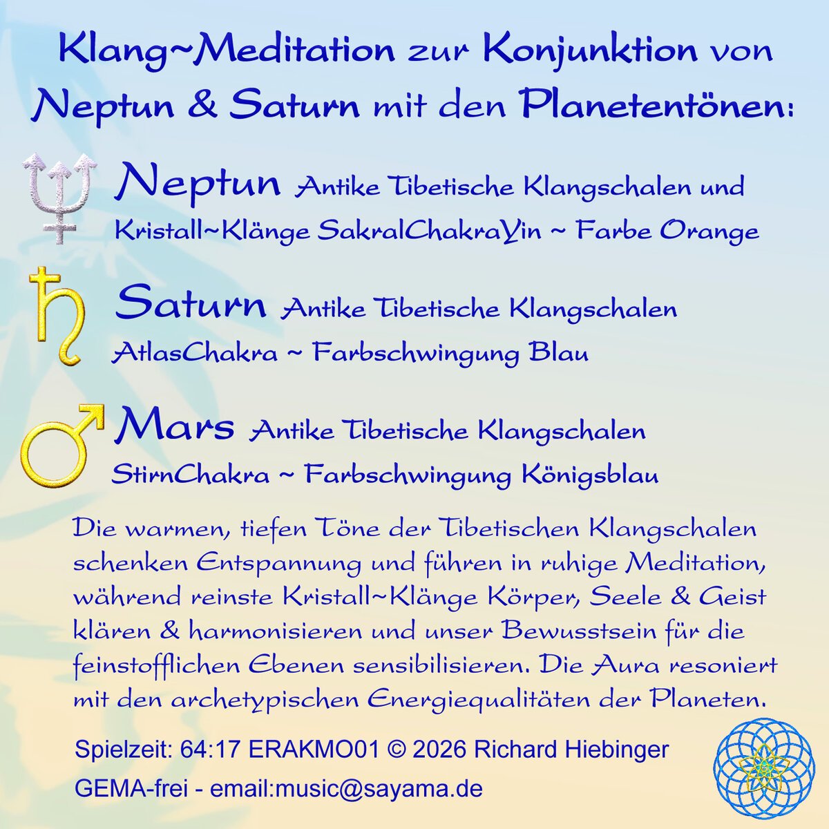 Antike Tibetische Klangschalen & Kristall~Klänge für deine Meditation zur Konjunktion von Neptun & Saturn mit Planetentönen. Die warmen, tiefen Klänge der Tibetischen Klangschalen fördern Entspannung und Meditation und reinste Kristall~Klänge klären & harmonisieren Körper, Seele & Geist. Die archetypischen Energien der Planeten resonieren in deiner Aura und können dabei helfen Visionen & Herzenswünsche auf die Erde zu bringen.
