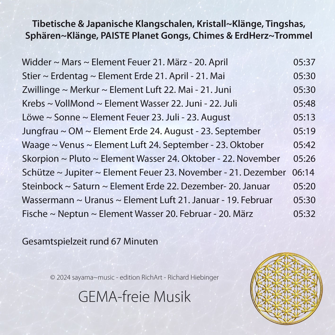 Mit den „Horoskop Sternzeichen Klängen" kannst Du die energetischen Qualitäten der 12 Sternzeichen im Tierkreis sinnlich erfahren. Sie wurden in klarer, warmer Klangqualität aufgenommen und basieren auf den sog. „Planetentönen", die sich aus ihrem elliptischen Umlauf um unsere Sonne ableiten. Die sanfte Erd~HerzTrommel erdet, Klangschalen & Gongs schenken Entspannung und die Kristall- & Sphären~Klänge tragen Dich in die Weite des Sonnensystems, während die fein glitzernden Klänge der Elfenklang~Kugeln & Chimes, gleichsam wie Sternenstaub, die Chakren & Aura reinigen. Nutze diese Klänge, um die Schwingung Deines eigenen Sternzeichens zu harmonisieren und intensivieren oder bestimmte Aspekte in Deinem Energiefeld zu integrieren!